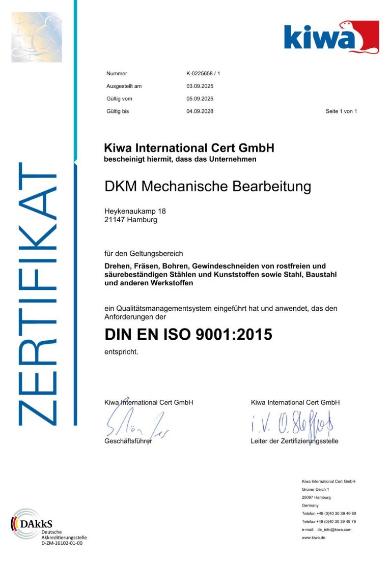 Unsere Kunden profitieren von reproduzierbaren Ergebnissen, stabilen Prozessen und einer transparenten Qualitätssicherung – exakt so, wie es die DIN EN ISO 9001 fordert. Vertrauen Sie auf zertifizierte Präzision und zuverlässige Zerspanung auf höchstem Niveau.
